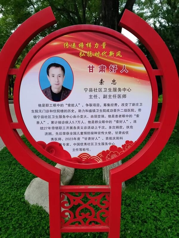 索忠,男,汉族,1973年1月出生,52岁,中共党员,甘肃省庆阳市宁县和盛镇人,本科学历(陕西中医学院中西医临床本科专业),中医内科主任医师。1997年6月甘肃中医学院中医医疗专业专科毕业。同年9月参加工作,先后在宁县焦村卫生院、新庄卫生院、和盛中心卫生院(即现在的宁县第二人民医院)、宁县社区卫生服务中心、宁县妇幼保健院工作。现担任妇幼保健院支部书记、院长。从医28年余。28年多来,他一直扎根基层,成长在基层,在行医路上兢兢业业,一心一意为患者,一心一意为单位谋发展。将每次接手过来的“烂摊子”,几经努力,最终都变成了“红火地”。他在搞好医者仁心份内工作的同时,又不忘社会责任,带领团队长期进小区社区、机关单位、学校及乡镇、村舍农户,开展免费议诊、宣讲、寻医问药、健康教育、体检、慢病随访等公益志愿活动,累计123场次,受益群众约11.72万人,深受广大居民朋友的广泛认可与普遍赞誉。