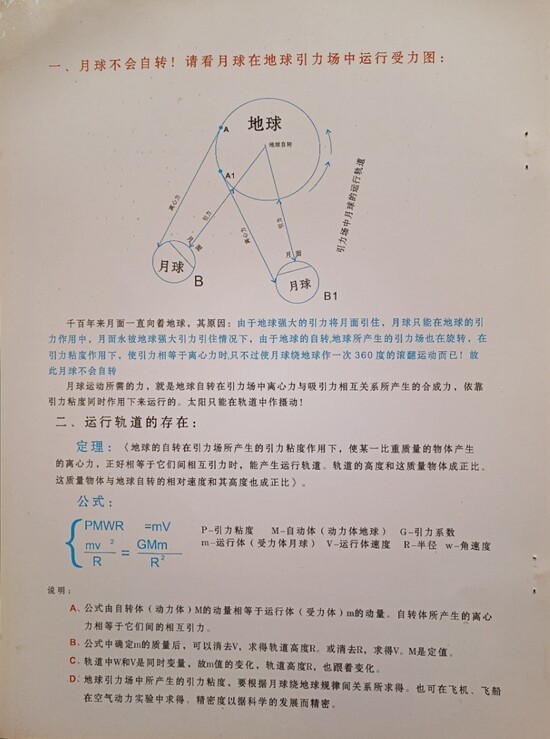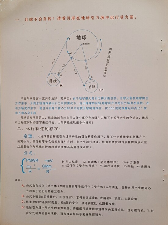 定理:《地球的自转在引力场所产生的!引力粘度作用下,使某一比重质量物体产生的离心力,正好相等于它们间相互引力时,能产生运行轨道。轨道的高度和这质量物体成正比。这质量物体与地球自转的相对速度和其高度也成正比》公式如下: