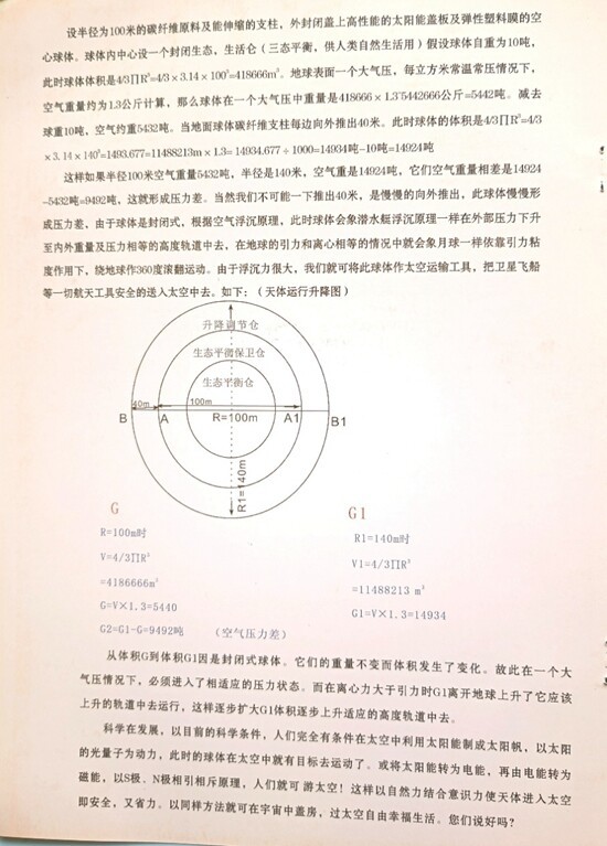 现在请有关领导和专家教授抓紧对我定理公式,研制方案进行审核论证,纠错和改进。如无异议我们马上行动,进行人造天体八角房研制应用。象潜水艇浮沉原理一样,在地球大气层中进行空气浮沉方法,产生内外压力差,即在宇宙各引力场内调节离心力和引力间关系,使八角房以内外压力差即体变量不变原理,自然安全升降在各自运行轨道和天地间!使人类能早日过上神仙般自然自由长寿幸福生活!