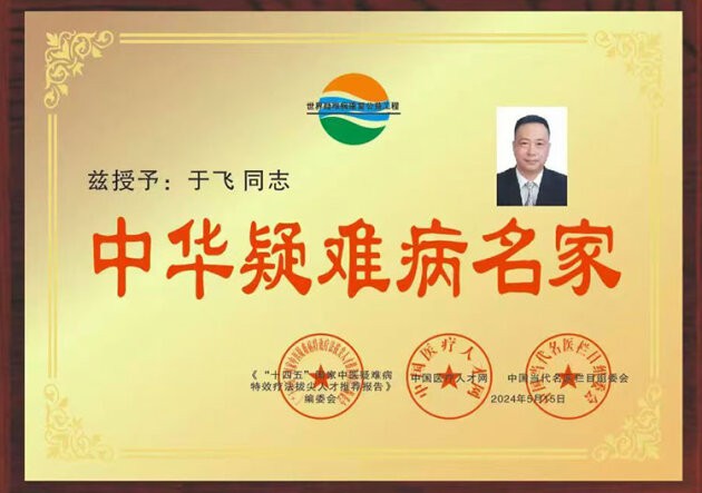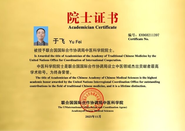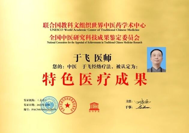 中国医养集团:2024年,被中国品牌协会吸纳为会员单位。2025年8月,参加第八届中国医师节,被评定为“优秀中医师”2025年11月被联合国教科文组织世界中医学药学学术中心,全国中医研究科技成果鉴定委员会评定《于飞经络疗法》认定为“特色医疗成果”并下发证书。